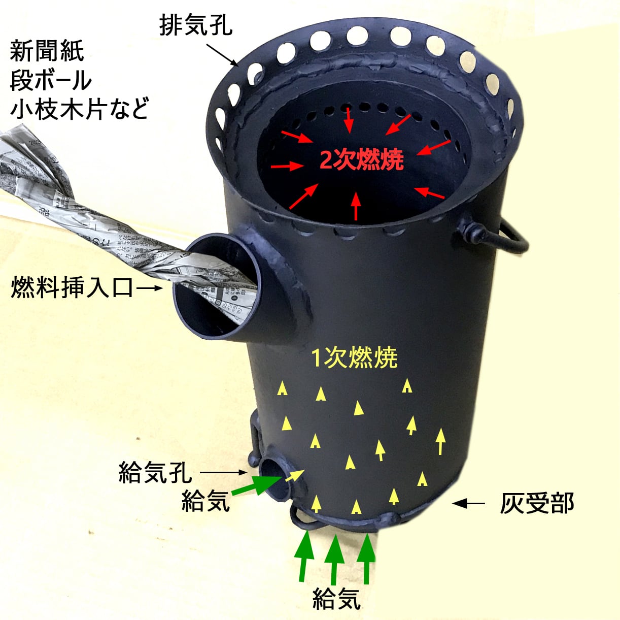 ※紙類を燃やすと灰が大量に火皿に積もって給気が出来ずに燃焼が弱まりますので